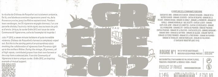 Cette cuvée "Grêle 2012 Rouge N°1" est une cuvée assemblant les raisins de nombreux vignerons locaux venus en aide au Château de Roquefort victime d'un terrible épisode de grêle en juillet 2012. Le vin est donc classé en Indication Géographique Protégée Vin de Pays de Méditerranée. Il y a deux versions du vin rouge, le Rouge N°1 et le Rouge N°2. Ce Rouge N°1 dégusté en juillet 2018 arborait une robe grenat sombre. A noter qu'il est sorti après la version Rouge N° 2 car l'élevage a été plus long pour cette cuvée. Le nez est un peu animal mais agréable. La bouche révèle une matière douce et soyeuse, riche (14°) sans chaleur, les degrés sont bien maîtrisés. Aves ses notes de cuir, le vin montre certes quelques signes d'évolutuion mais il possède curieusement une personnalité forte et attachante.