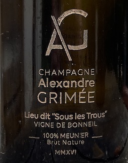 Ce Champagne cuvée "Sous les Trous" d'Alexandre Grimée provient d'une parcelle éponyme sur le terroir de Bonneil dans l'Aisne. Le sol est argilo calcaire et la parcelle exposée au sud. Alexandre Grimée ne cultive qu'un hectare de vignes, plantées en 1973, de cépage pinot meunier. Cette bouteille vinifiée en cuve inox est issue de la récolte 2016. Le bouchon n'indique pas l'année. Seule la cuvée est utilisée. C'est un Brut Nature dégorgé en janvier 2020. Production de 1.661 bouteilles numérotées. Robe or jaune clair et mousse très fine, abondante, très active en juillet 2021. Le nez est élégant sans vinosité marquée. La bouche évolue sur un fruité acidulé avec une certaine finesse et de la fraîcheur. La finale est plus serrée avec une légère pointe d'amertume. Le vin a sans doute besoin d'une bonne aération pour se révéler.