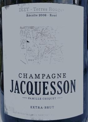Ce Champagne rosé "Dizy Terres Rouges" millésime 2008 de la maison Jacquesson est un parcellaire de pinot noir d'une vigne du terroir 1er cru de Dizy plantée en 1993. A noter que désormais cette cuvée est élaborée en blanc et non plus en rosé (premier millésime en blanc 2012), La maison ne fait donc plus de Champagne rosé. Il est élaboré par macération de raisins égrappés et vinifié puis élevé en foudres. Dégorgement de février 2014 avec un dosage de 3,5 g/l. La production a été de 8.708 bouteilles et 396 magnums. Robe incroyablement teintée, presque rouge, en juin 2022. La mousse est très fine et abondante. Joli fruité au nez mêlé à des notes d'oxydation ménagée. C'est un Champagne rosé de table, puissant, finement vineux, à la personnalité affirmée. Il a conservé un bon fruité même si celui-ci a évolué avec les années.