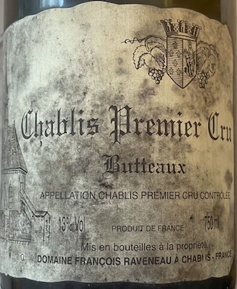 Robe or jaune clair en décembre 2025 pour ce millésime 2004 de la cuvée de Chablis 1er cru "Butteaux" du domaine Raveneau. Le nez est élégant, finement mielleux et floral. La bouche s'avère vive avec une jolie minéralité et une richesse subjectivement moyenne (13°) mais parfaitement adaptée. Le vin est en pleine forme, encore jeune, très parfumé.