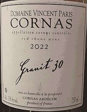 Robe rubis sombre en février 2026 pour ce Cornas cuvée "Granit 30" millésime 2022 du domaine Vincent Paris. Elevage en cuves puis en fûts pour cette syrah issue de jeunes vignes. C'est un vin agréable, souple, de bonne intensité (13°), déjà bien ouvert sur le plan aromatique, épices et petits fruits noirs.