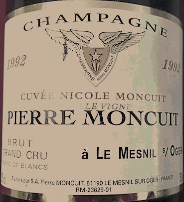 La robe de ce millésime 1992 de la cuvée "Nicole Moncuit" vieille vigne du domaine Pierre Moncuit était or pâle en 2000. Le nez est vif, sur les agrumes. C’est un vin bien plein pour le millésime avec les caractéristiques notes mielleuses et de brioche de cette cuvée. La puissance habituelle du cru en moins. Ce millésime 1992 peut vieillir comme tous les vins de cette cuvée de très vieilles vignes du Mesnil. Une autre bouteille dégustée en janvier 2026 n'avait malheureusement plus de mousse mais seulement une fine effervescence. La robe est teintée, dorée. C'est un vin riche, porté par une jolie acidité mais qui manque de relief et dont la palette aromatique évoque la torréfaction. Une bouteille pourtant toujours bien conservée mais le bouchon a du mal se comporter dans le temps.