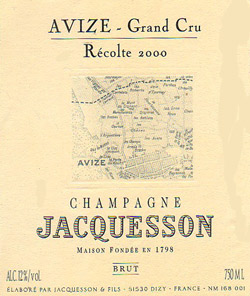 Robe or jaune clair en octobre 2008 pour ce millésime 2000 de la cuvée de Blanc de Blancs Grand Cru d’Avize millésime 2000 de la maison Jacquesson. Il s’agit du dernier exemplaire de cette cuvée car avec la récolte 2002 ce seront des cuvées parcellaires d’Avize qui verront le jour permettant ainsi d’offrir le meilleur du terroir pour chaque millésime retenu. Ce millésime 2000 assemble donc les parcelles de Champ Caïn, La Fosse et Némery. Le tirage est de 32.107 bouteilles. La mousse est évidemment très belle, fine et active. Ce champagne vinifié sous bois et comme toujours dosé en extra brut à 3,5 g/l a été dégorgé au 1er trimestre 2008. Il s’exprime actuellement sur une palette aromatique plus fruitée, fruits jaunes, que minérale. De belle maturité il est sec et tendu avec un fin rancio parfaitement intégré. Longiligne et équilibré il possède une belle personnalité avec une complexité qui s’exprimera encore mieux à l’issue d’une garde supplémentaire dans une cave fraîche. Robe dorée et mousse très fine en février 2026. Dégorgement et dosage identiques. Le nez développe désormais un fin rancio et des notes évoquant le bois. La bouche s'avère très tonique avec une acidité marquée et une finale plus chaude évoquant les saveurs des liqueurs de dosage. Cela manque d'harmonie et le vin semble avoir passé son optimum.