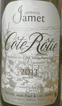 Robe rubis sombre aux bords légèrement évolués en mars 2026 pour ce millésime 2013 de la cuvée de Côte Rôtie classique du domaine Jamet. Joli nez très expressif, lardé, fumé, olive noire. La bouche, subjectivement plus intense que ses 12°5 annoncés, séduit par son classicisme et la sensation d'harmonie dans l'expression de son cépage et de son terroir. L'acidité ressort toutefois après un passage en carafe qui n'apparaît donc pas nécessaire.